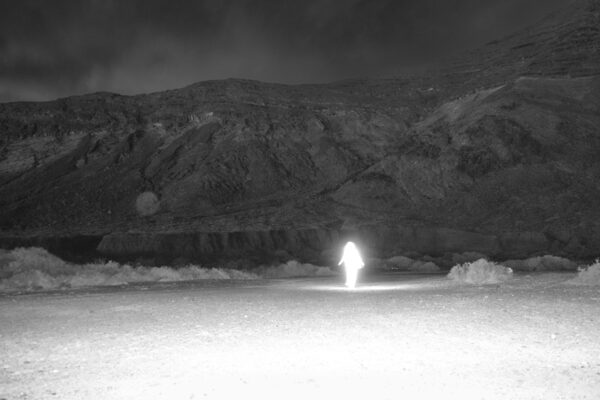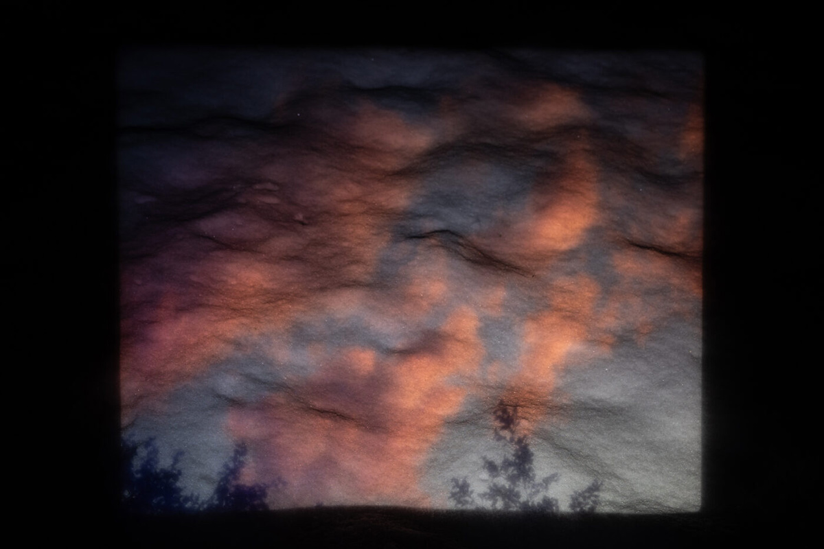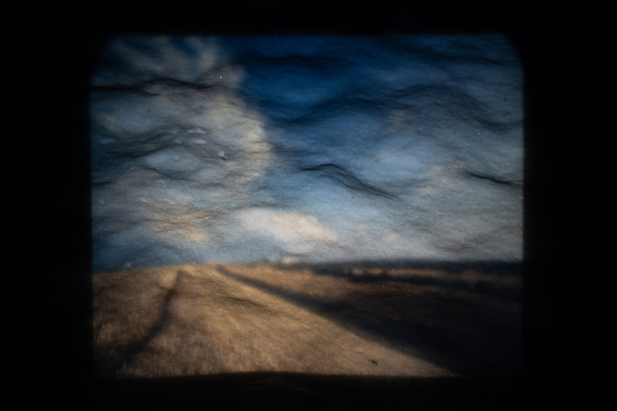 “The original photographer repeatedly captured the sky, much like a child exploring through repetition, an act of pure observation unburdened by meaning. Over time, these images grew on me. Their consistency became a language, a quiet meditation on looking. In their persistence, I saw both a child’s wonder and an adult’s need to hold onto the fleeting. By projecting these slides onto my body and the snow, I shift their original intent. The past meets the present, and the act of rephotographing them transforms their purpose, infusing them with new meaning shaped by my presence.”