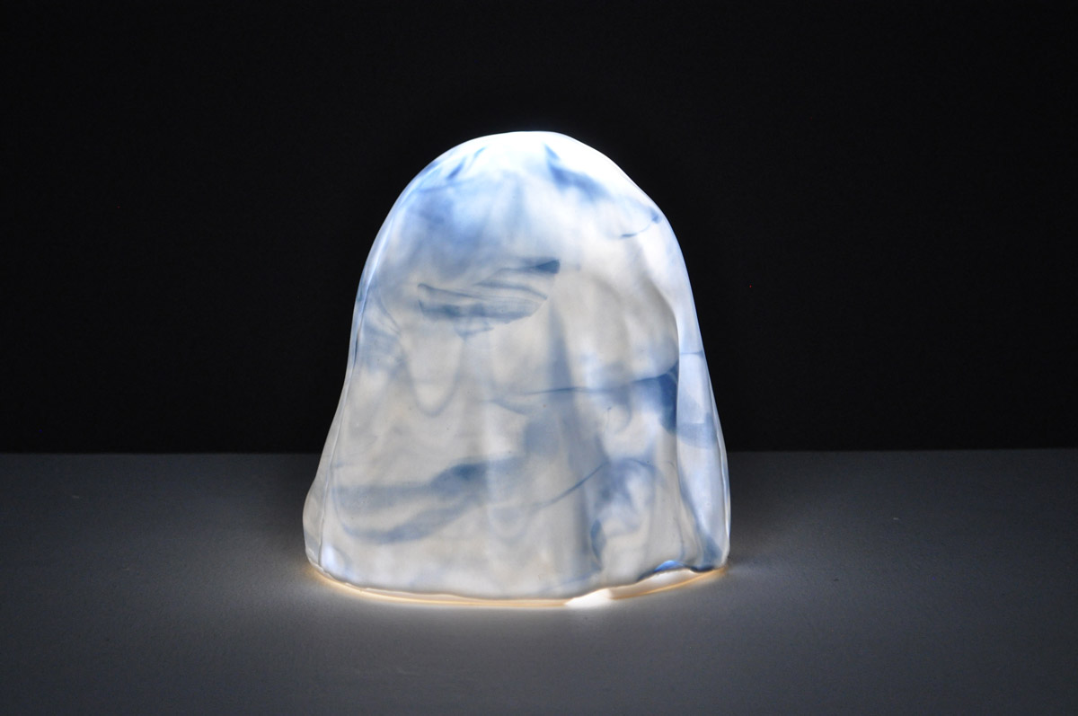 ZH: The lamp is made from a type of ceramic process called slip casting. Soft/Light is made of porcelain, a translucent ceramic body. The shape of the lamp was created from a balled-up quilt I had made the year prior. I balled up the blanket and vacuum formed it (essentially heating up a sheet of plastic and vacuuming it over the blanket to create a mold). From there I took the mold and poured a plaster model (the positive form). I then sanded down the form until it was smooth, leaving some of the ridgelines from the blanket. With that plaster model, I created my slip cast mold and used that mold to pour the lamp form. As for the cup, it is an exact replica of a glass cup. A similar process, except I made a silicone mold from the glass and then poured my plaster model from there.