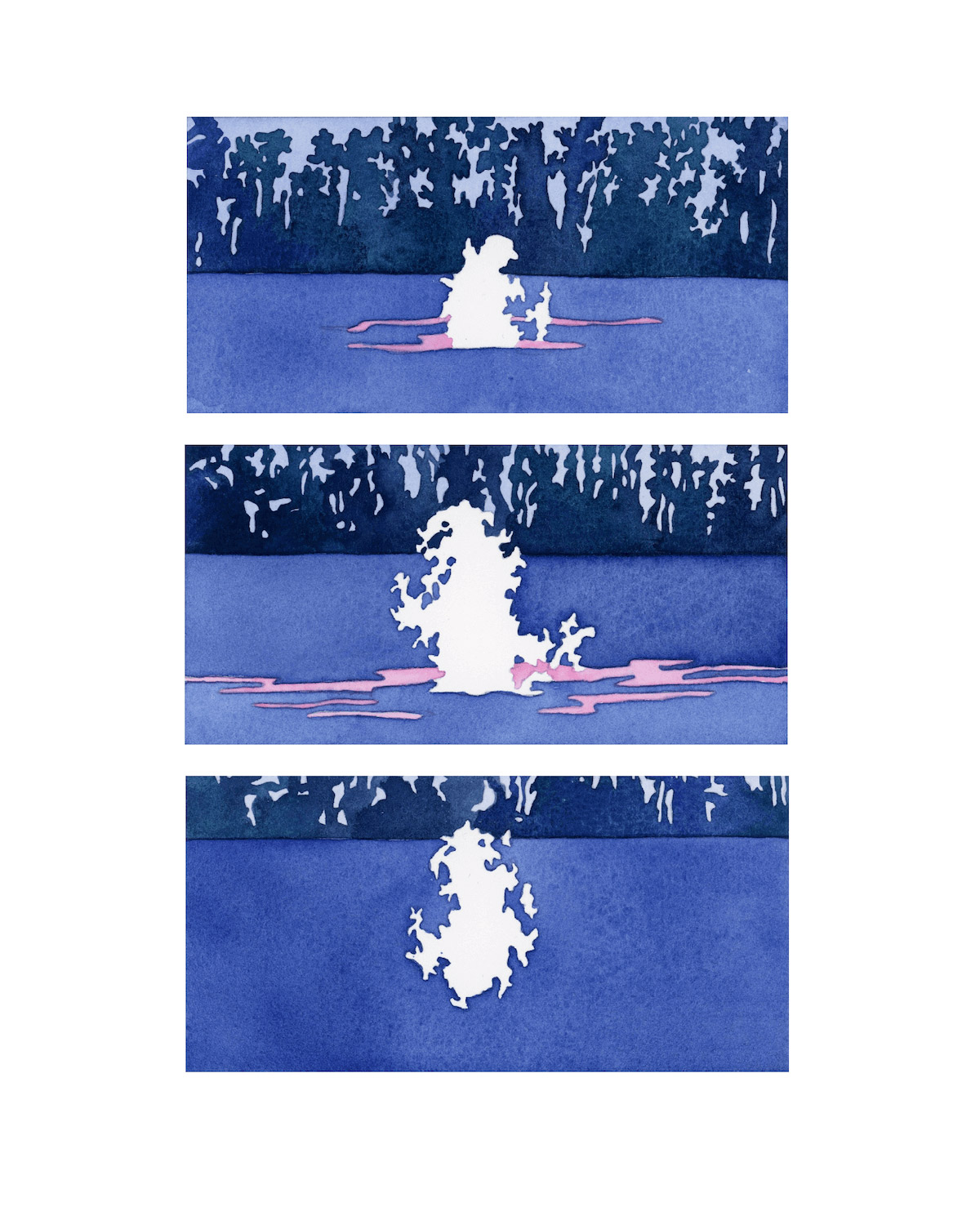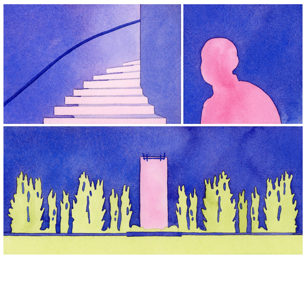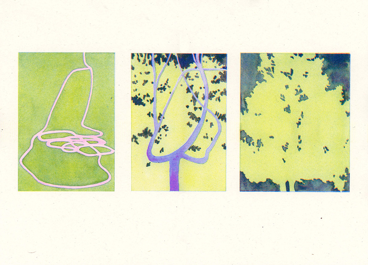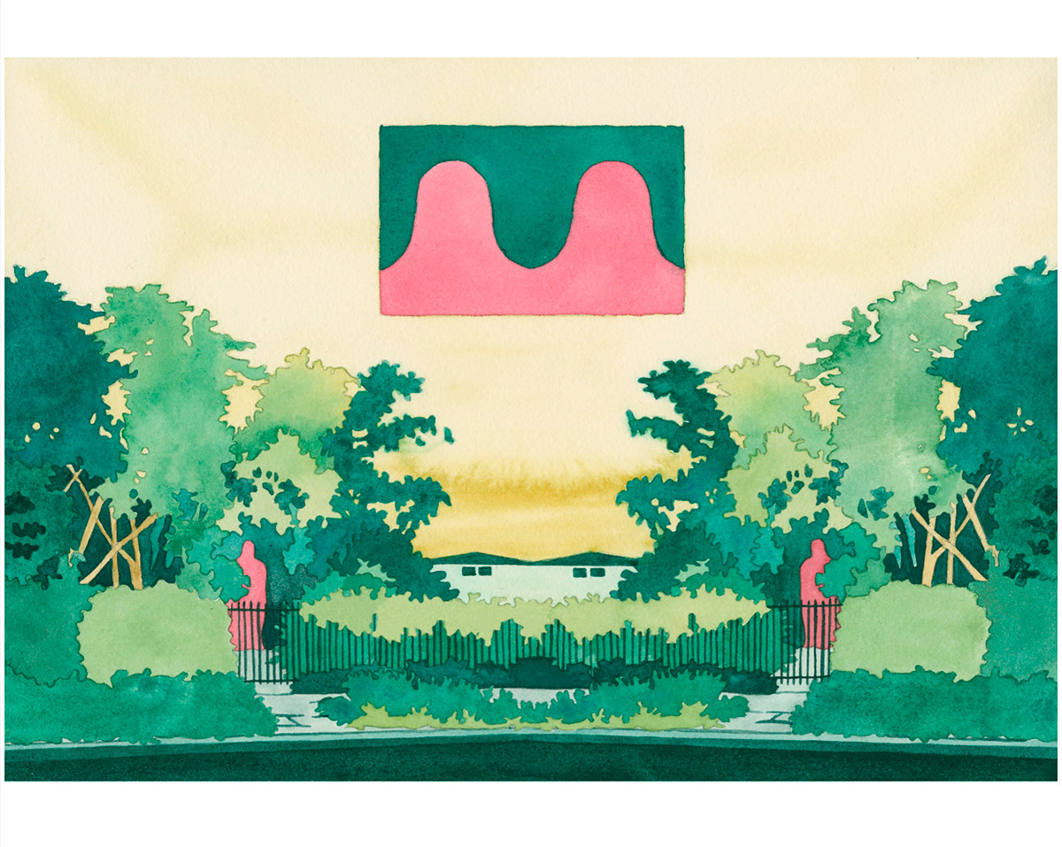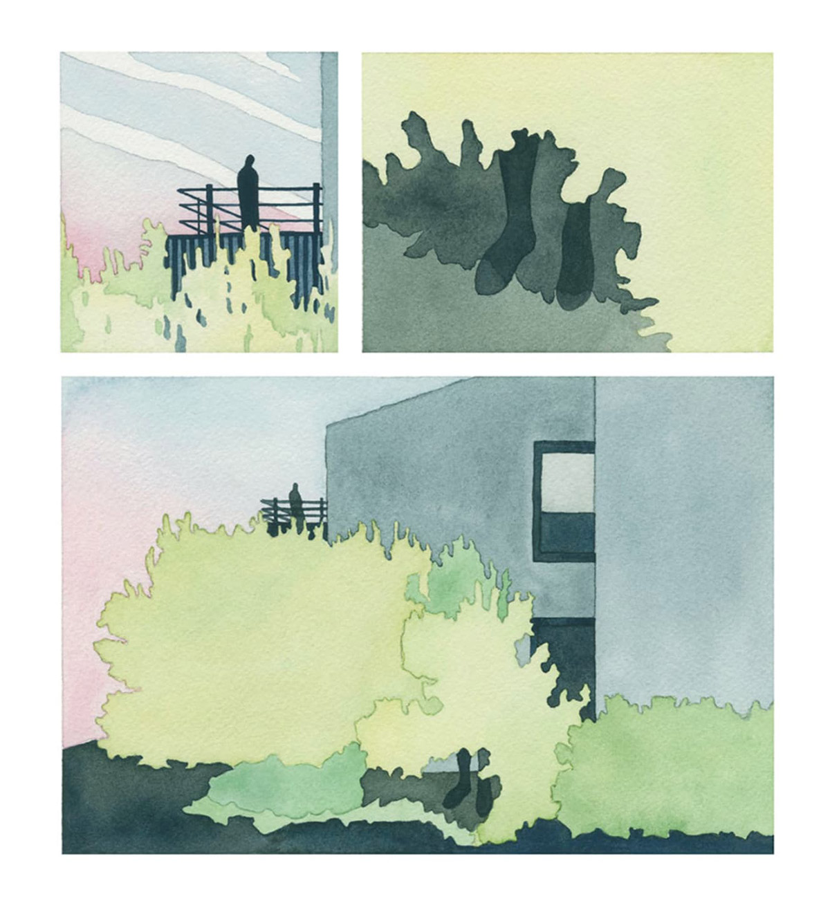 A selection of work from UK-based illustrator and artist Joanna Blémont. Using sequential frames, Blémont explores issues through multiple lenses. Her watercolours delve into ideas around time, place, and the boundary between the familiar and strange through everyday scenes. Her process involves working from memories, dreams, and photo archives. Blémont describes her practice as tracing “partially figurative scenes where details indicating a specific time or place are subtracted and the image seeks to appeal to a collective gaze. Natural forms and built environments intertwine ambiguously, immersing the viewer in the language of dreams.”