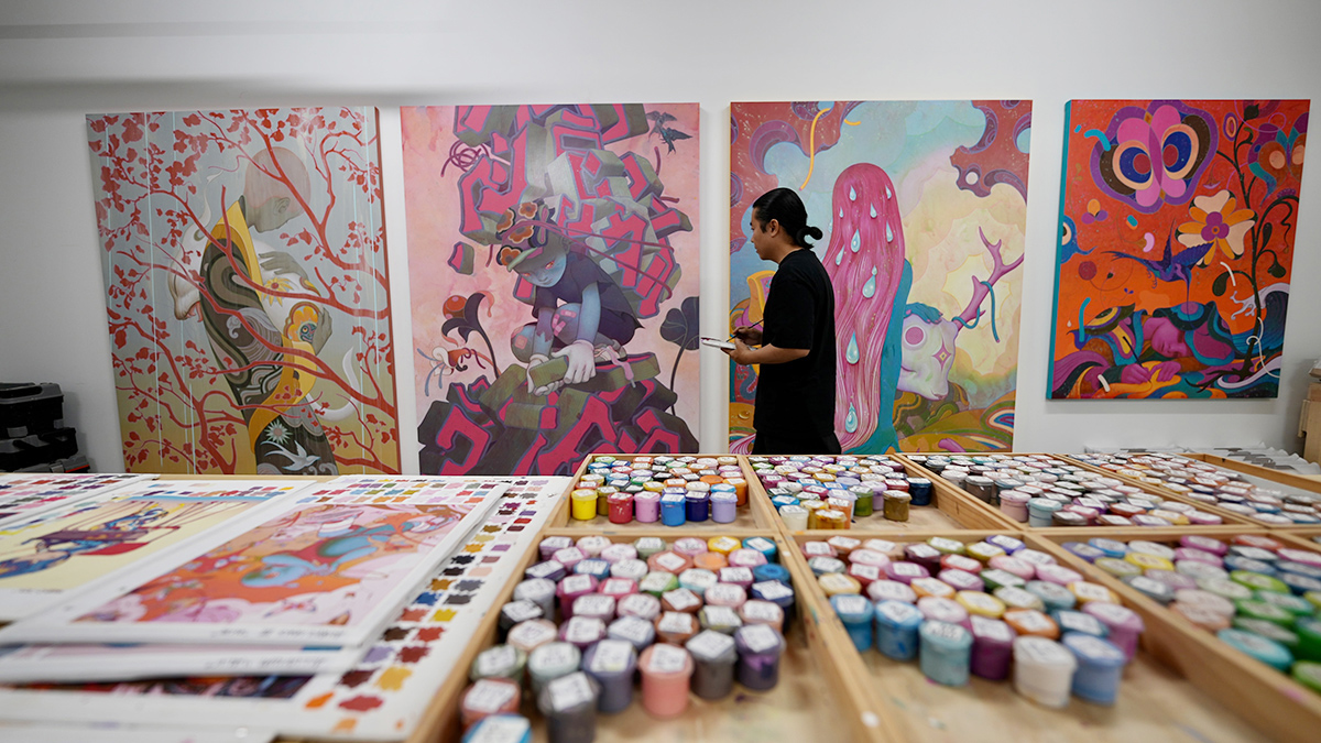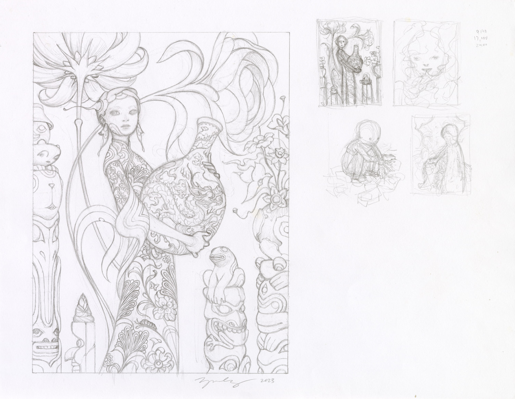 James Jean: Dragon II was completed first in the fall of 2023, and I think Nomad was completed last. Dragon II was a bellwether of how the rest of the pieces would go. Actually, the end is a blur, because I was preparing so many different projects at once before traveling to Japan in June. I’m checking through my camera roll aka memory bank, and it’s quite stunning how many things I was doing all at once in April and May.