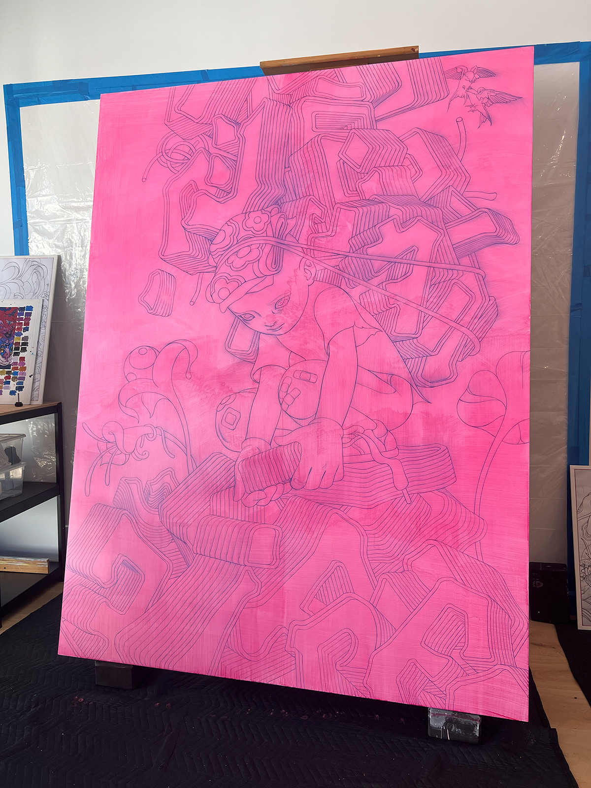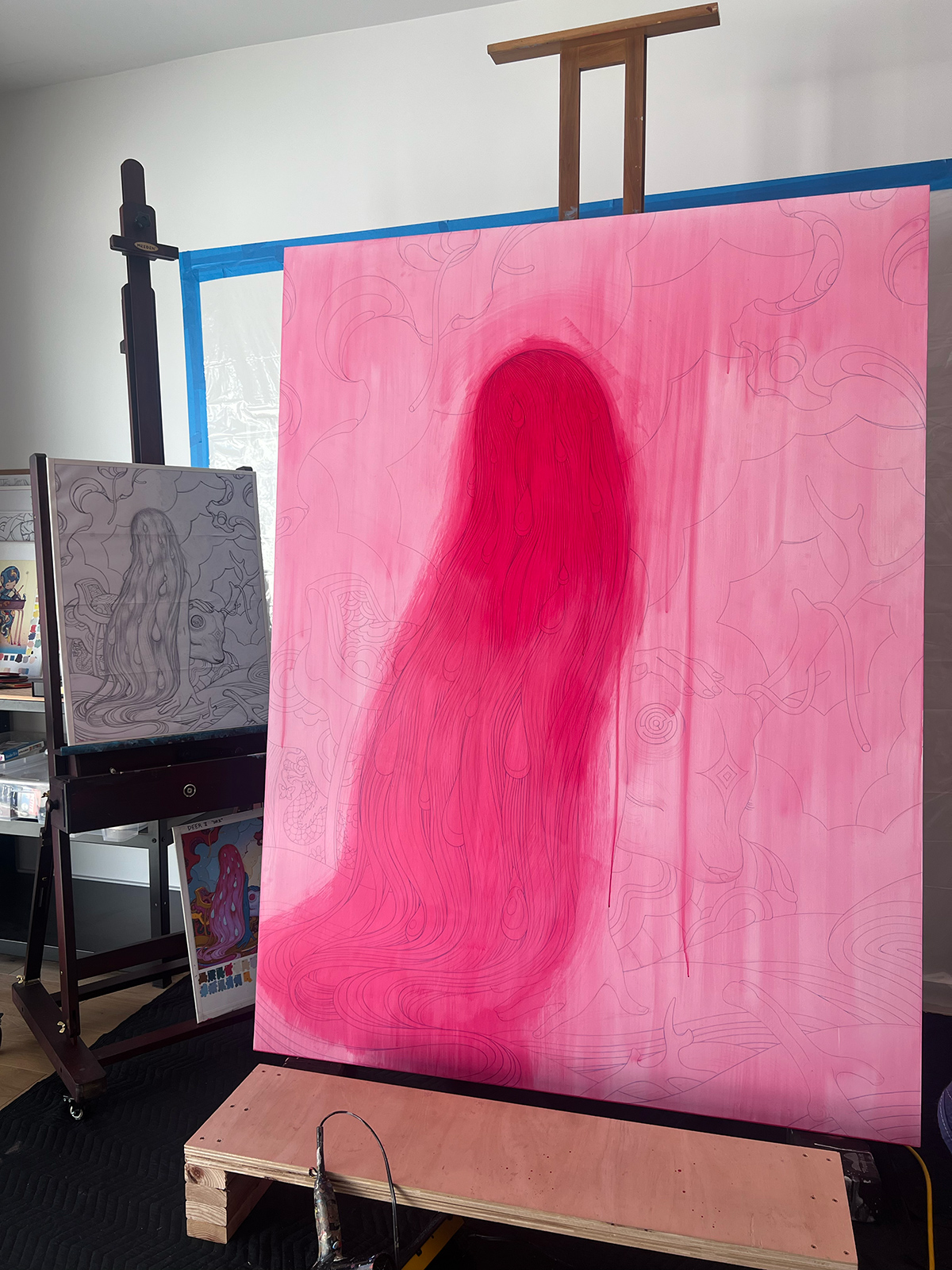 As a younger artist, I was looking at so much of the external world and absorbing influences from everywhere. Now that I’m older, I’ve become more inward facing and trying to develop and understand the recurring motifs and patterns in my own work. Actually, as I write this, I just returned from visiting Yoshitomo Nara’s home and studio in the countryside earlier today. He says he no longer worries about deadlines, and works alone in the studio without assistants. Vast green fields surround his property. It’s an idyllic existence that I long for, but life in Los Angeles is fast paced and resource hungry.