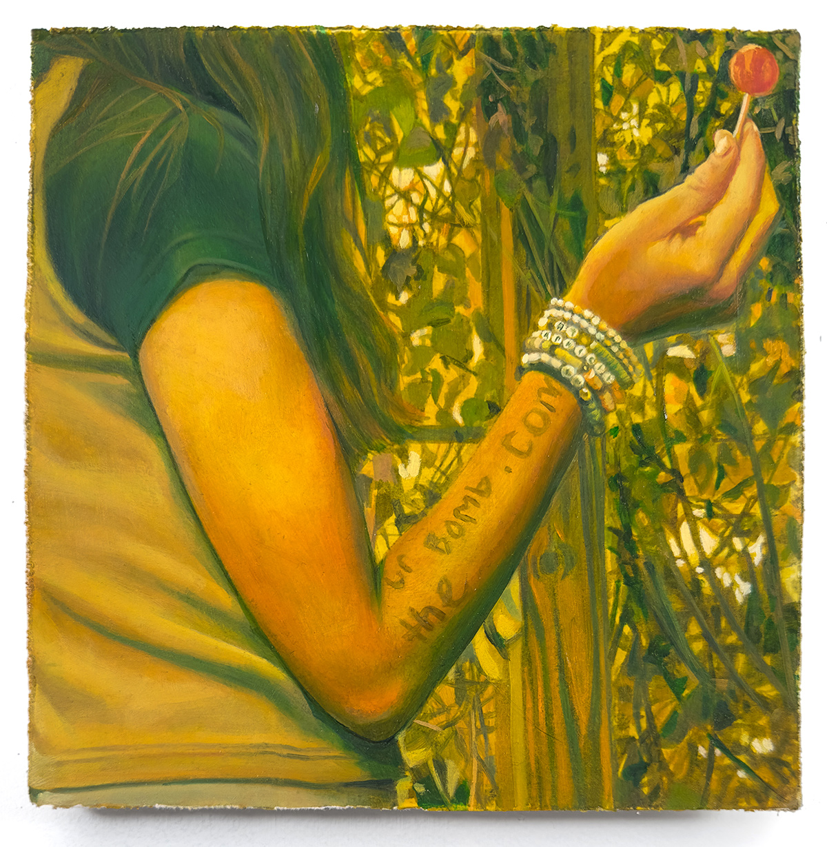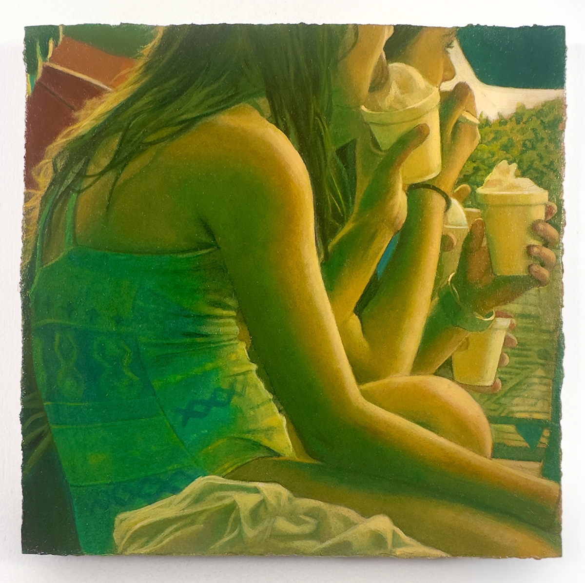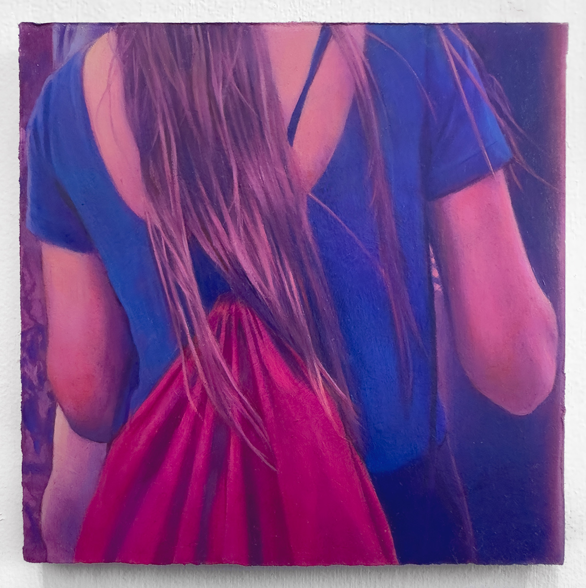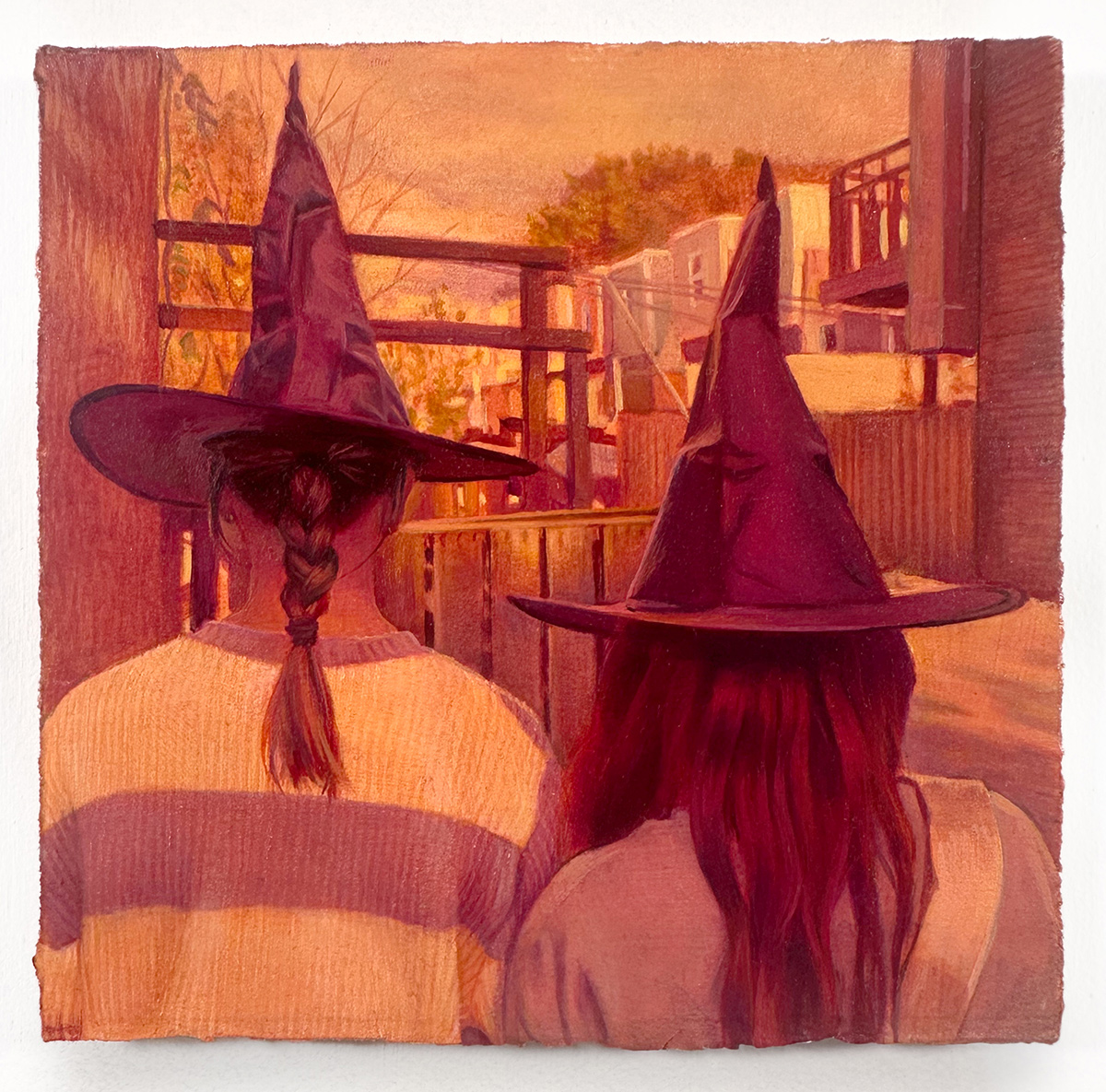 “Because my compositions tend to center on the ephemeral, the intimate and the fragmentary, I typically work from low-resolution corners of larger reference photos. The resulting painting process is highly interpolative, and involves supplementing my source material with extensive visual research as well as direct observation. The highly-saturated and largely invented palette shifts the images away from a feeling of immediate perception and towards a more interior space informed by mood and memory.”