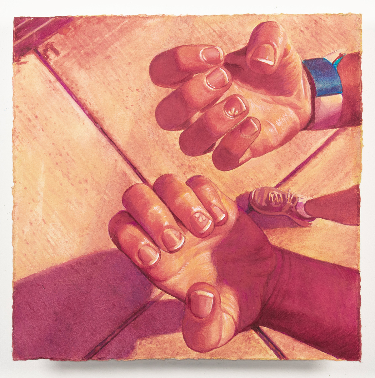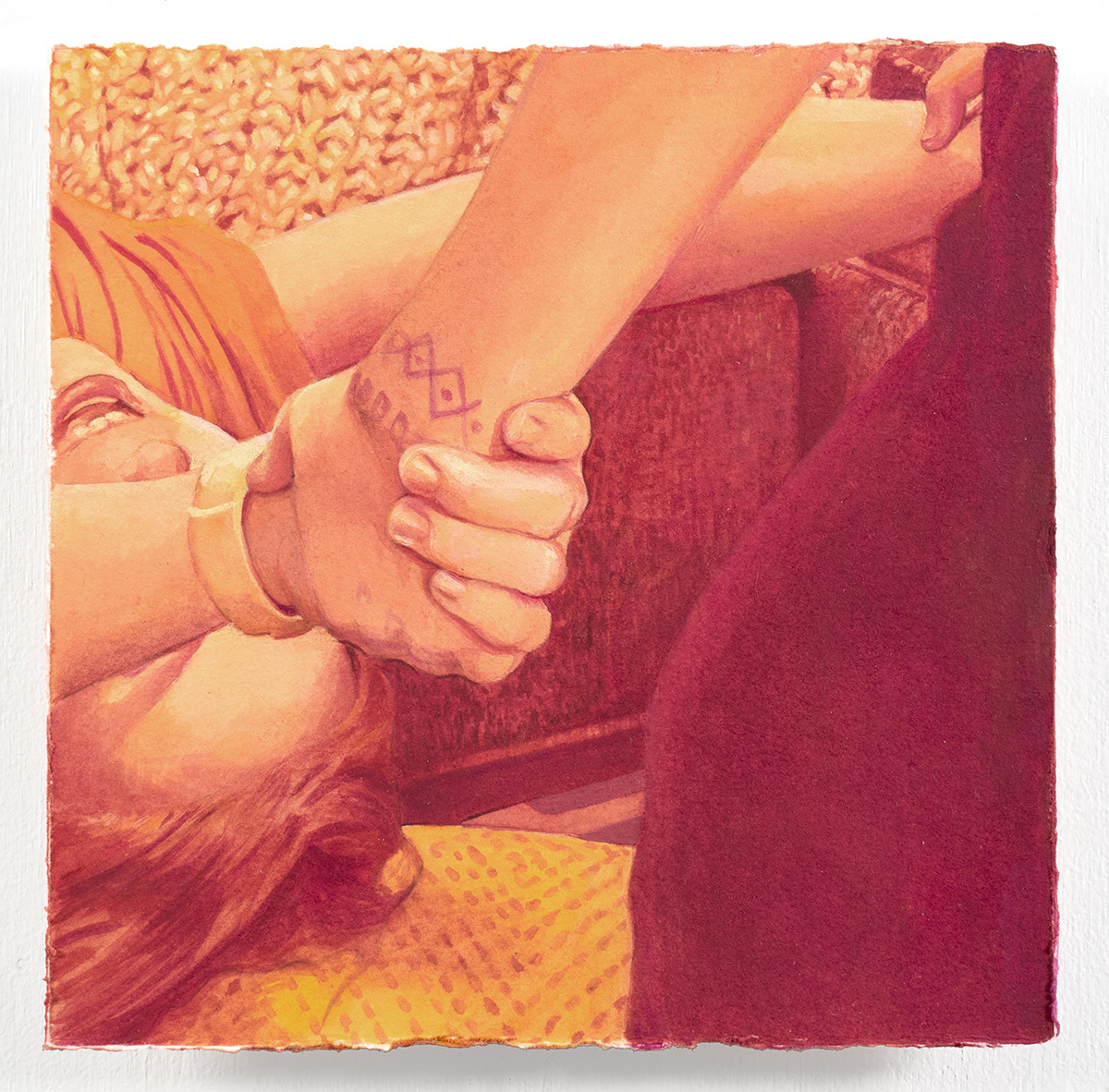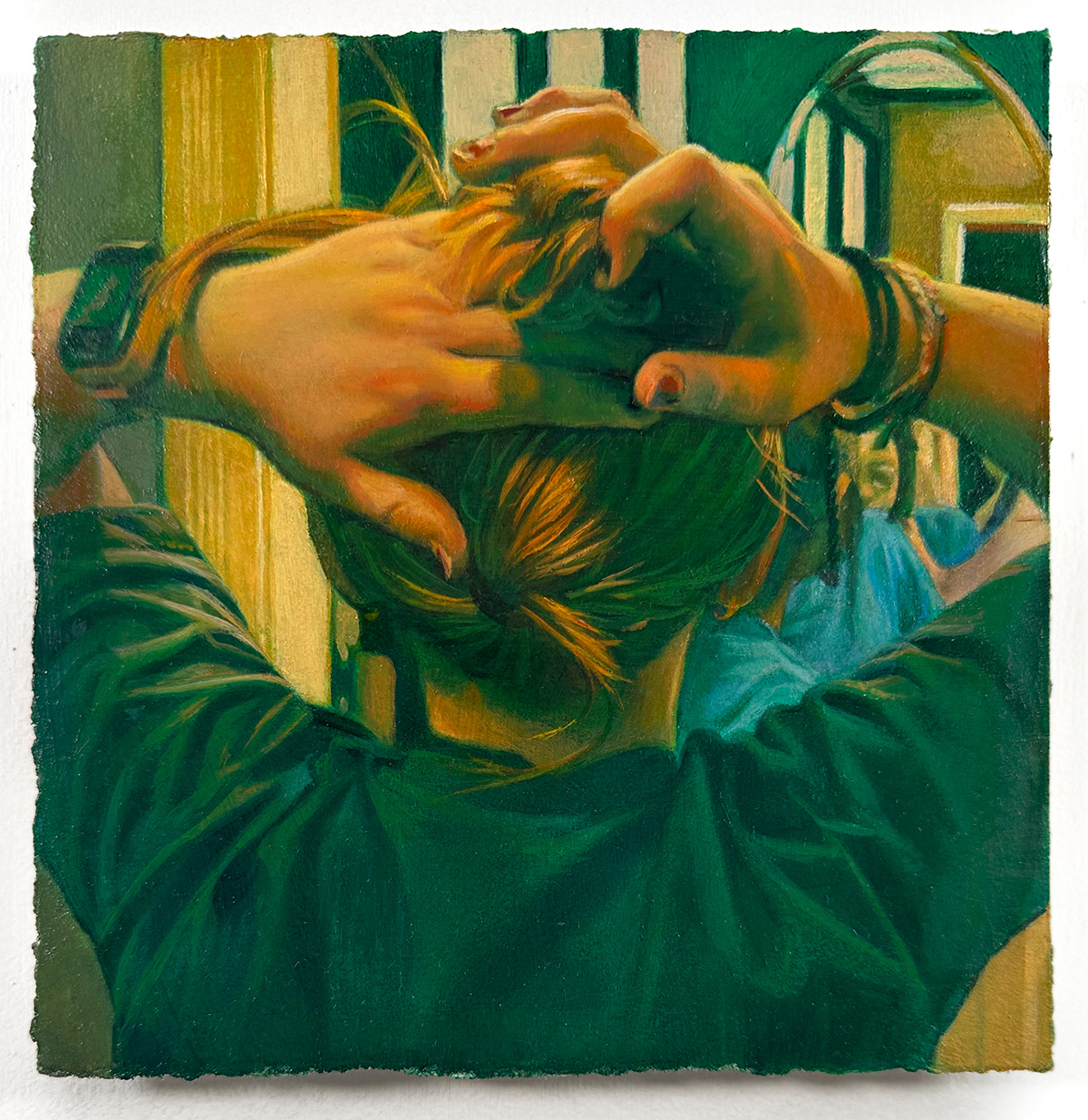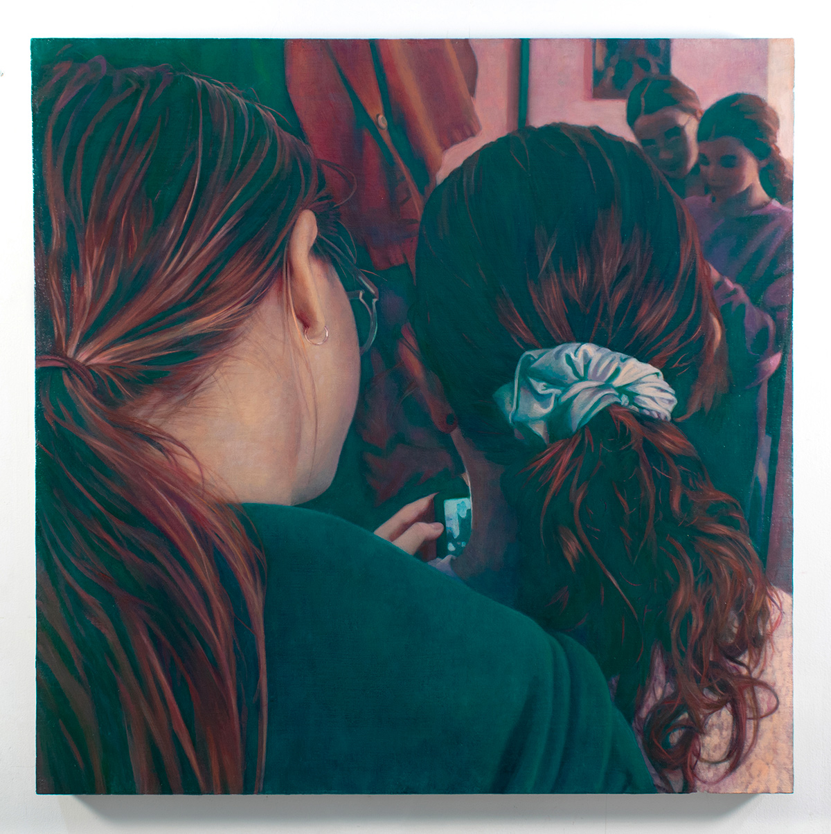 In this way, the series is also about motherhood and the sense of “time travel” Henderson herself experiences in the presence of her adolescent collaborators (her daughter and daughter’s friends). “I observe them in the rear-view mirror or from the bleachers,” Henderson describes “my personal sensory memories of braces, split ends and peeling nail polish are always present.” Sourcing her imagery from an archive of personal iPhone snapshots, Henderson is interested in the capacity of representational painting to draw attention to what may have originally been casual or peripheral visual information: