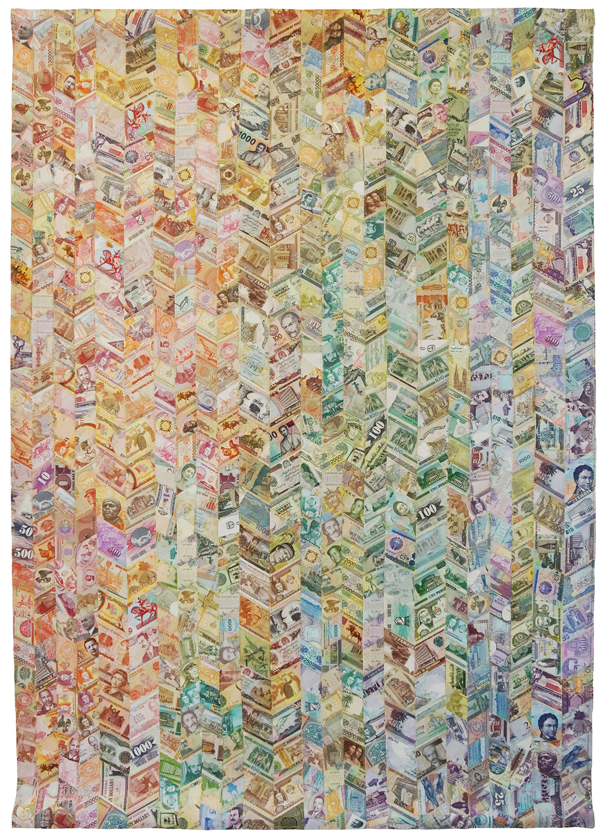 A delicate deconstruction of the economic and geopolitical systems that govern our world by South African artist Faith XLVII (previously featured here). In “Venarum Mundi,” Faith XLVII uses discontinued currency, maps, and flags to literally weave together complex commentaries on value, borders, and shifting global forces. Her intricately hand-sewn tapestries reimagine the boundaries of wealth and place, earth and sea. Meticulously crafted, the artwork draws attention to the fabric of our reality, its fragility, as well as the inherent tensions of migration and territoriality. With each piece Faith XLVII calls into question the very materiality from which it was made—signals of stability rendered obsolete.