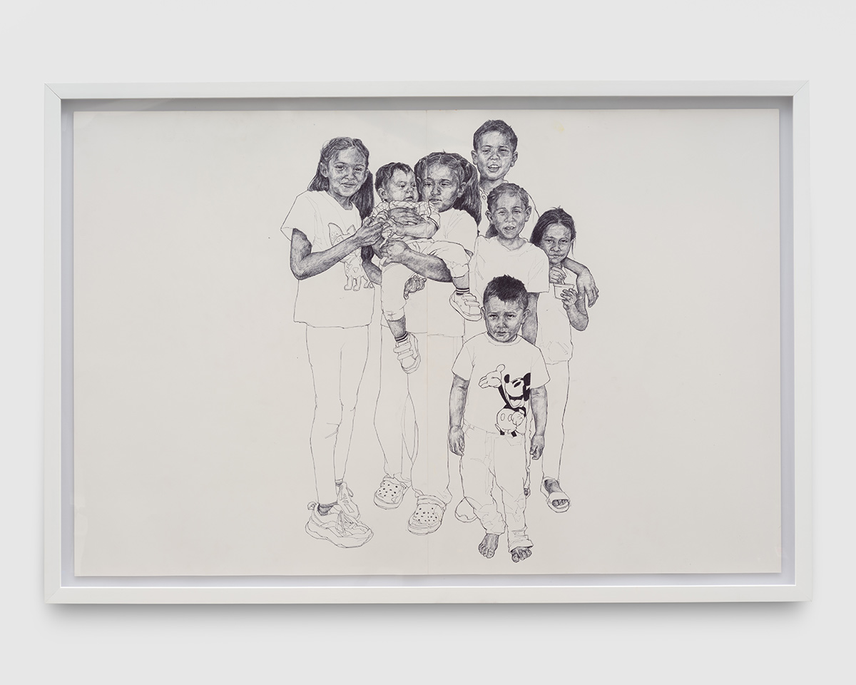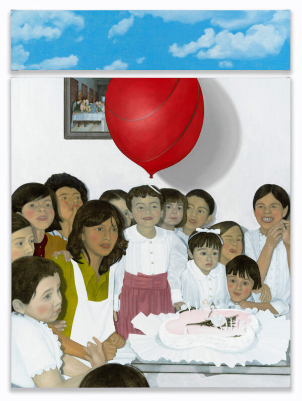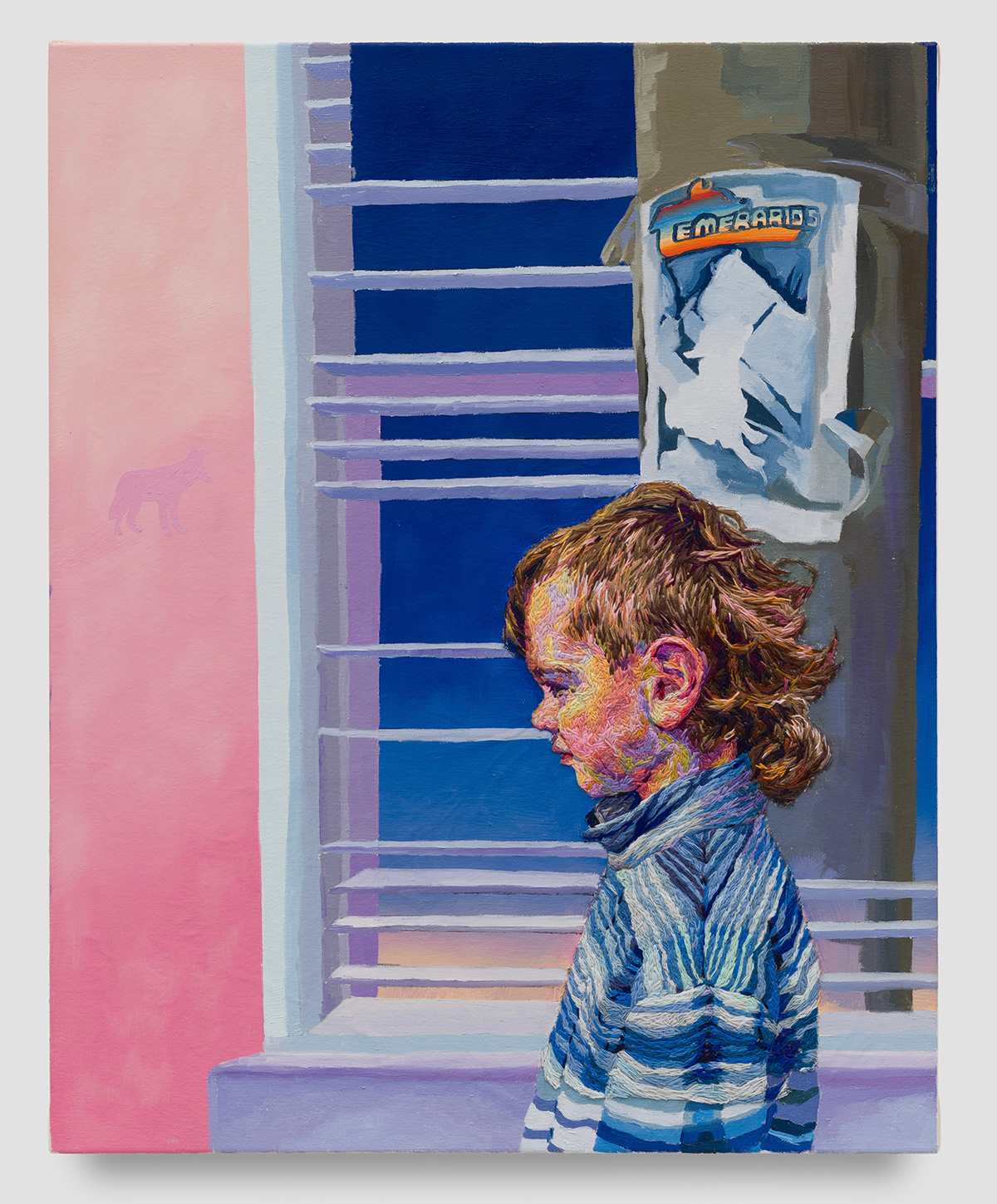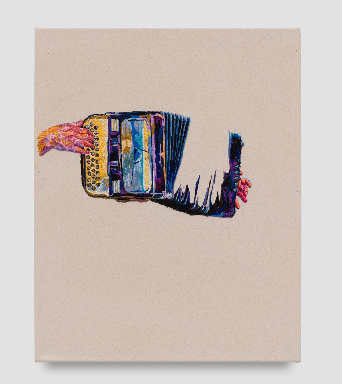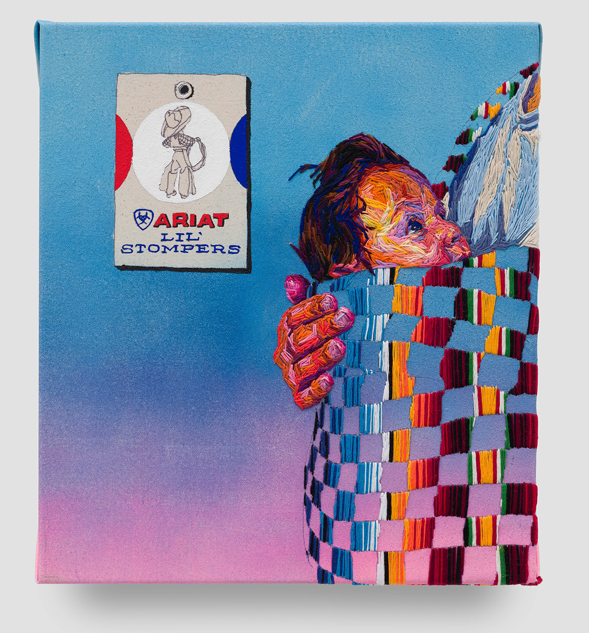 “Amanecer / Atardecer (Sunrise / Sunset)” marks García Hamilton’s first exhibition with Charlie James Gallery. Her works involve a combination of embroidery and oil painting. As a first-generation American, García Hamilton investigates legacies of tradition, the inevitability of assimilation, and the ways in which family histories replay themselves over time. She draws from an archive of family photos and stories, threading family members together across generations and borders. Many of the works in the exhibition feature García Hamilton’s late grandfather and her young nephew, his great-grandson who he never got a chance to meet. Her use of embroidery is similarly a reflection of her family history as it is something she took up after the passing of her grandfather. Both of García Hamilton’s grandparents worked in textiles and her grandfather was also the storyteller of the family.
